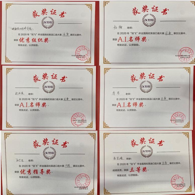 近日,我校收到2020年“讯飞杯”全国高校英语口语大赛组委会颁发的获奖证书和奖品。在此次比赛中,天天干夜夜操获得“优秀组织奖”, 张思佳老师获得“优秀指导奖”,天天干夜夜操杨梅、李琴、边洁英三位教师获得“A.I.名师奖”,工商管理学院李思媛同学获得三等奖。