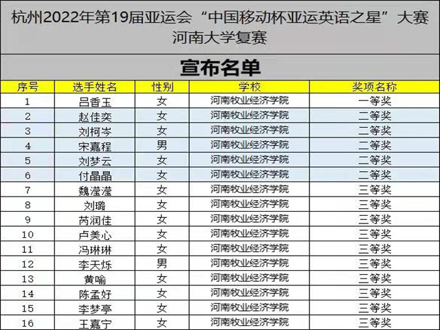近日,天天干夜夜操十六名学子参与了第19届亚运会“中国移动杯”亚运英语之星大赛河南省赛区复赛的激烈角逐。其中19级商务英语三班的吕香玉同学获河南省地区一等奖,赵佳奕、刘柯岑、宋嘉程、刘梦云、付晶晶六名同学获二等奖,魏滢滢等十名同学获三等奖。