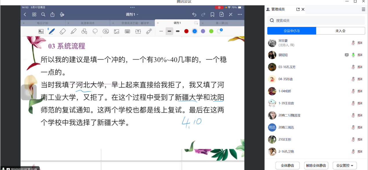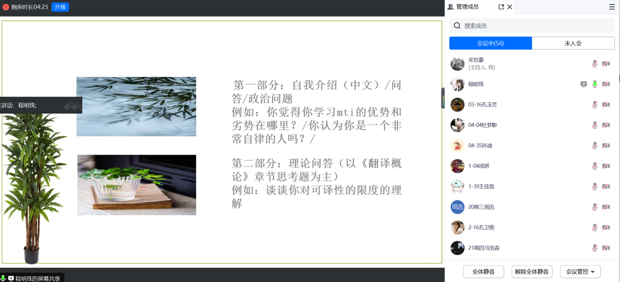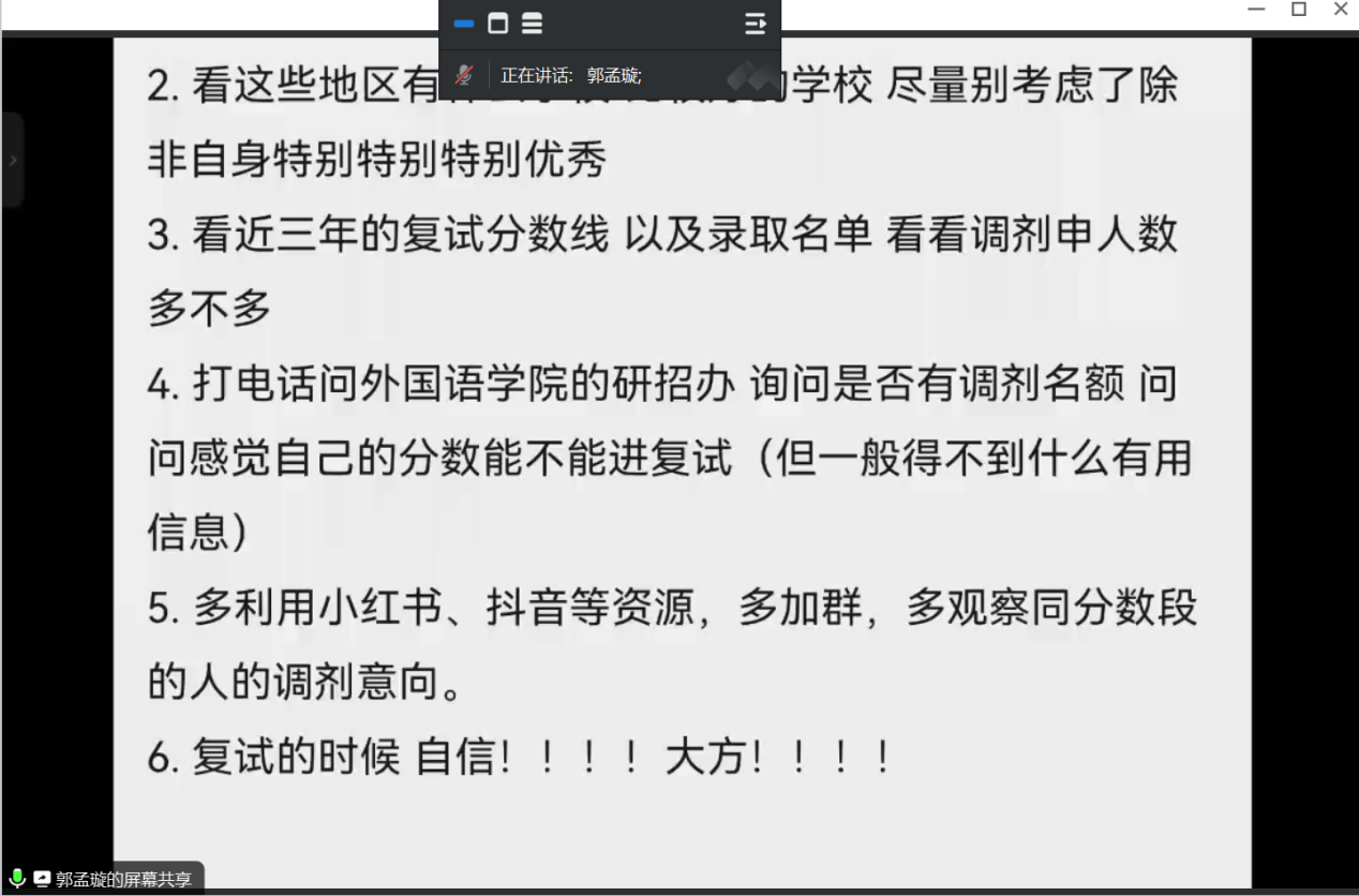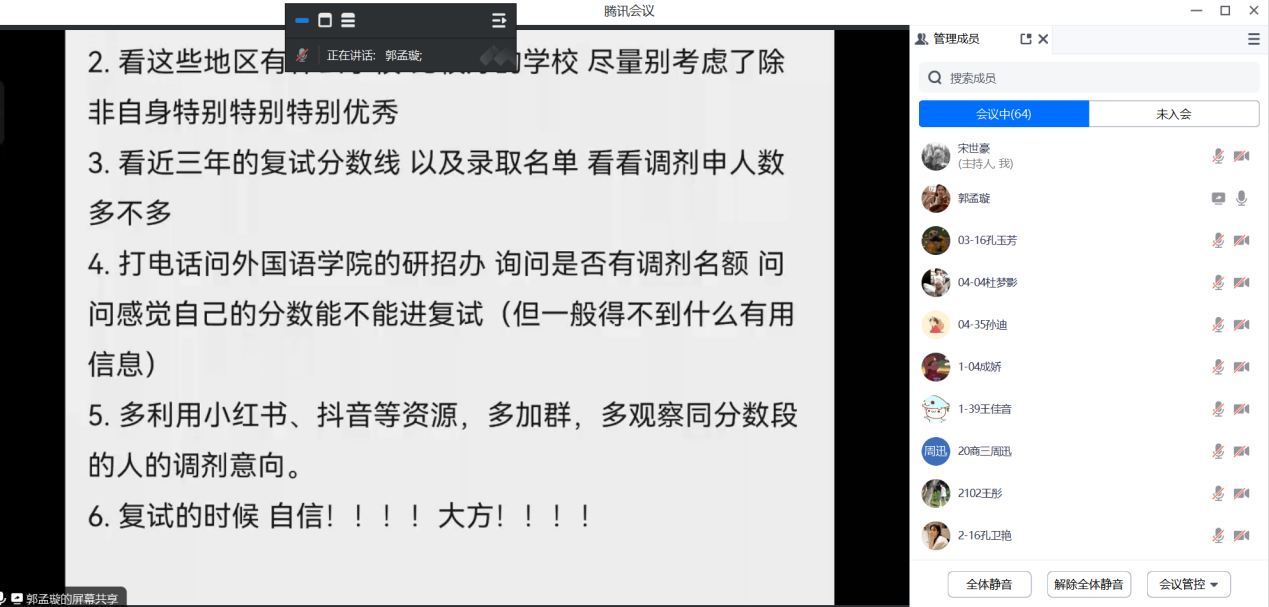 为帮助参加考研复试及准备调剂的学生强化相关技能、提升复试通过率,3月17日,天天干夜夜操利用腾讯会议线上开展2024届商务英语专业学生考研复试及调剂分享会。由2018级、2019级考研上岸学生裴妞妞、郭梦璇、程明珠、张勇、刘柯岑等进行经验分享,2020级考研学生参加,会议由商务英语教研室副主任宋世豪主持。