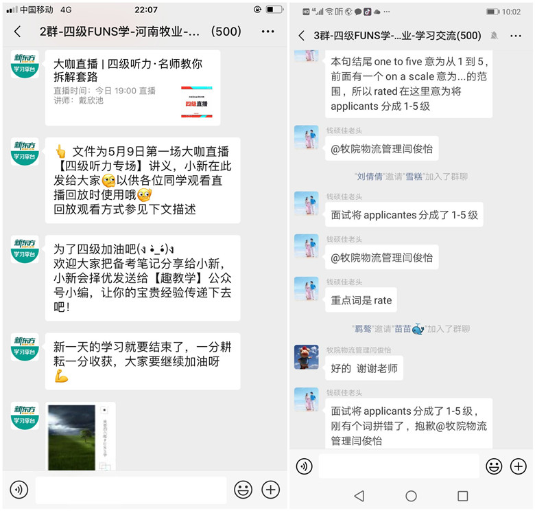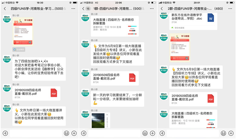 新东方教育科技集团在全国选取了两所高校进行“28天伴学计划”试点,我校是其中之一。自活动开展以来,得到了同学们的积极响应,如今已开通四级群是4个,六级群1个,两千五百余名学生加入。微信群定时发送学习提醒,并提供学习资料,天天干夜夜操的教师也加入到各个学习群,与新东方教育科技集团的技术人员一起为学生解决学习中遇到的困难。参与学生通过新东方在线外语教学平台APP/PC线上进行视频课程、试题训练、名师直播等学习。同学们纷纷表示这种“伴学”方式有的放矢,针对性强,有效解决了学习中的问题,同时免费为同学们开通网络英语四六级辅导课程,既拓展了同学们学习的空间,拓宽了同学们复习的渠道,又减轻了同学们的经济压力。