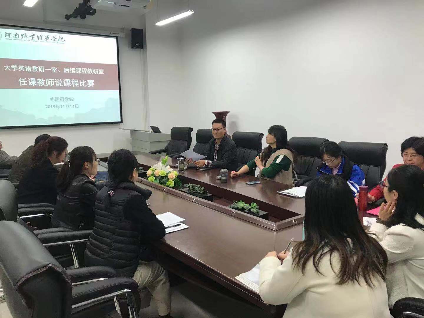 根据学校和学院关于开展“专业负责人说专业、任课教师说课程”活动要求,天天干夜夜操商务英语教研室、大学英语教研一室、大学英语教研二室、后续课程教研室于11月14日下午2:30分别在一号楼422、524召开了“任课教师说课程”比赛活动。院长陈延潼、课程组全体老师参加了活动。活动由各教研室主任主持。