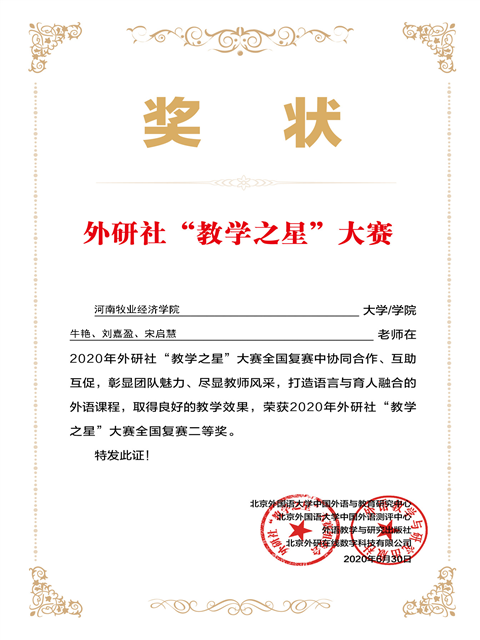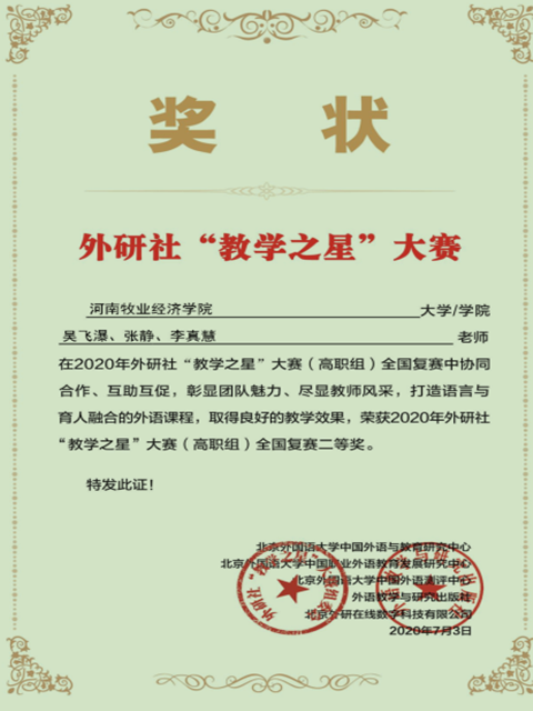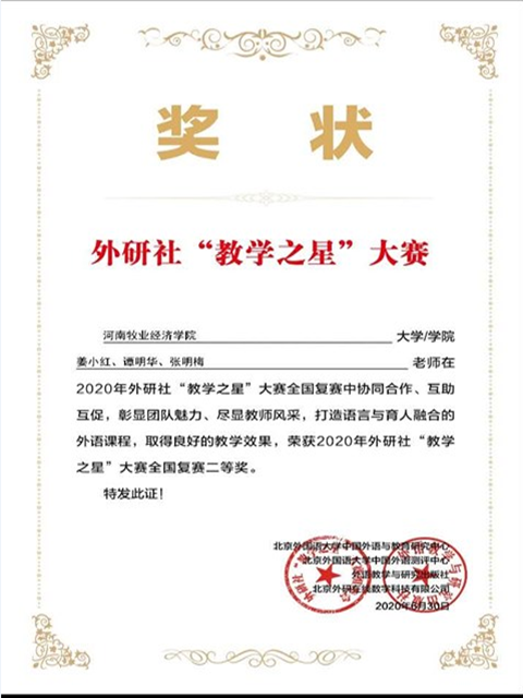 2020年天天干夜夜操师资培训以“语言与育人融合的外语课堂教学设计”为中心,结合信息技术对语言教学的影响和促进,展开课堂教学设计的研讨与评比。5月,我院选拔组建三个教师团队参加2020年外研社“外研之星”教学大赛,在全国复赛阶段,我校以姜小红、谭明华、张明梅组成的团队获得英语类专业组二等奖,以牛艳、宋启慧、刘嘉盈组成的团队获得大学英语组二等奖,以吴飞瀑、张静、李真慧组成的团队获得高职组二等奖。6-7月,我院组织了全体教师参加了我校2020年度教学技能竞赛,各教研室围绕“上好一节课”进行线上集体研讨,相互听课评课,推选出三名教师参加学校教学技能比赛,最终韩淑俊获得在全校比赛中获得一等奖,崔海飞获得三等奖。在河南省本科教育线上教学优秀课程评选活动中,我院杨柳、吴国权、刘燕、宋一然组成教学团队的《大学英语4》和赵阳、许海兰、温晶晶、韩淑俊组成的教学团队的《英语写作》两门课程获得河南省本科教育线上教学优秀课程二等奖。