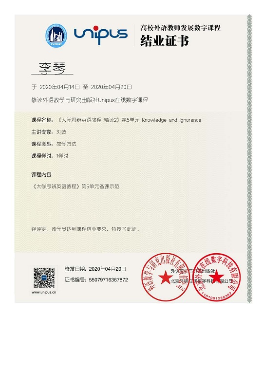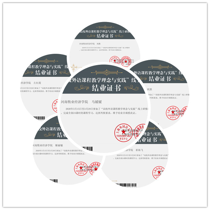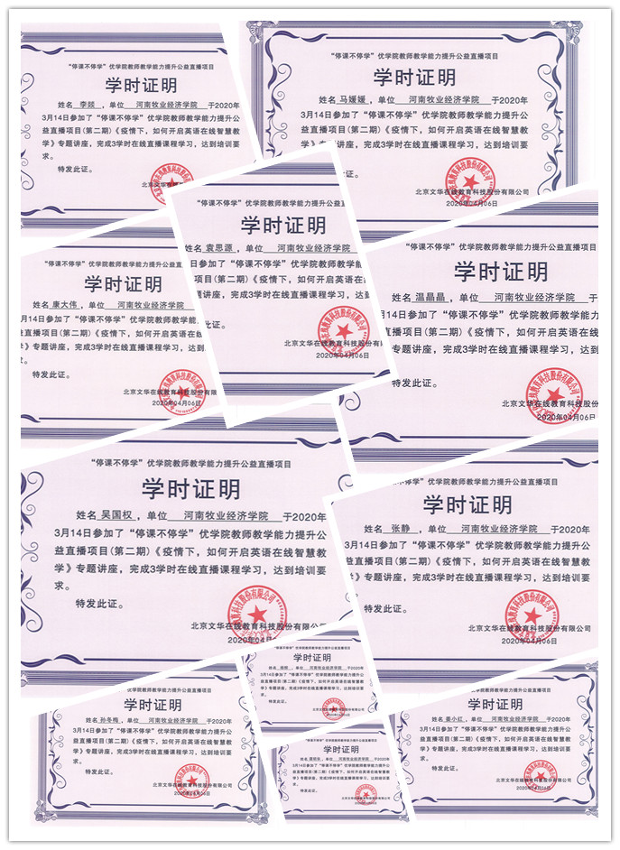 疫情期间,天天干夜夜操共组织教师参加了42场讲座培训,由于上课等原因错过直播的老师也观看了回放,有65名教师通过培训考核,获得证书。天天干夜夜操精心组织,讲座前有通知、海报,预告讲座要点,讲座中实时发言讨论,讲座后研讨总结。突如其来的教学模式变化给大家带来了前所未有的挑战与全新体验,通过系统的培训与学习,教师们由疫情初期的仓促上阵,到逐步适应、熟练应用,天天干夜夜操的网络教学得到了学生的肯定与欢迎,在河南省本科教育线上教学优秀课程评选活动中,天天干夜夜操的《大学英语4》和《英语写作》两门课程通过我校遴选,推荐到省教育厅参与本科教育线上教学优秀课程评选。