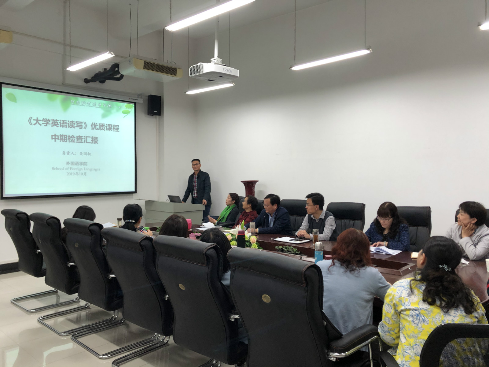 我院校级优质课程《大学英语读写》负责人、大学英语教研一室教研室主任吴国权进行中期检查汇报。吴老师从课程基本情况、主要建设内容、对标自评、努力方向四个方面进行了汇报,重点介绍了在“河南牧业经济学院在线教学平台”上建课的情况以及开展线上线下混合式教学情况。与会人员听取汇报之后,认真查看了课程建设的相关材料,提出了中肯的建议。