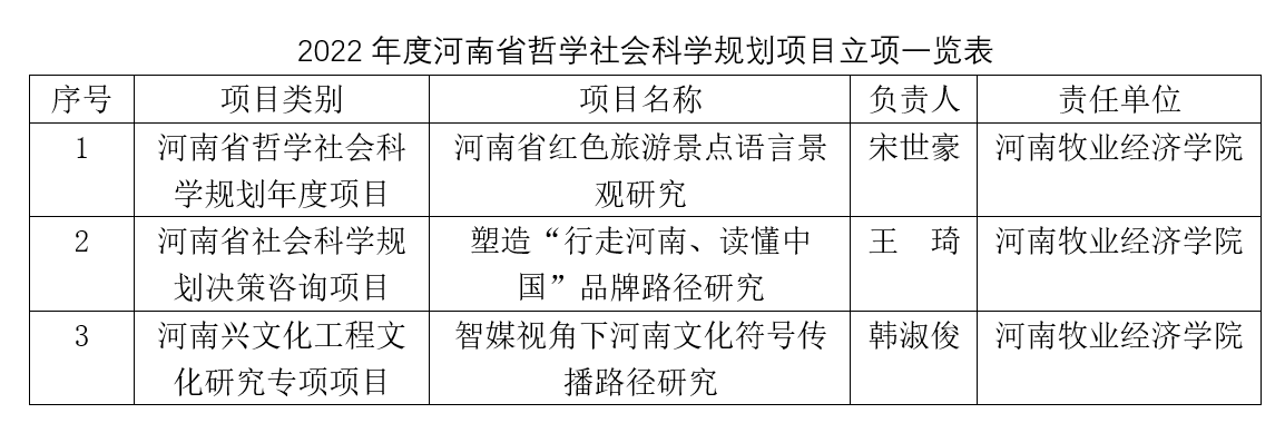近日,河南省哲学社会科学规划办公室公布了2022年河南省哲学社会学科规划项目的立项名单。我院韩淑俊博士主持《智媒视角下河南文化符号传播路径研究》获批河南兴文化工程文化研究专项项目,宋世豪博士主持《河南省红色旅游景点语言景观研究》获批河南省哲学社会科学规划年度项目,在读博士王琦老师主持《塑造“行走河南、读懂中国”品牌路径研究》获批河南省社会科学规划决策咨询项目。
