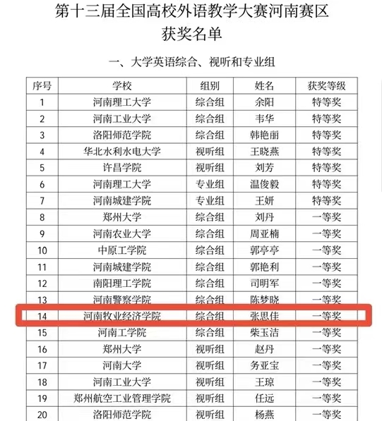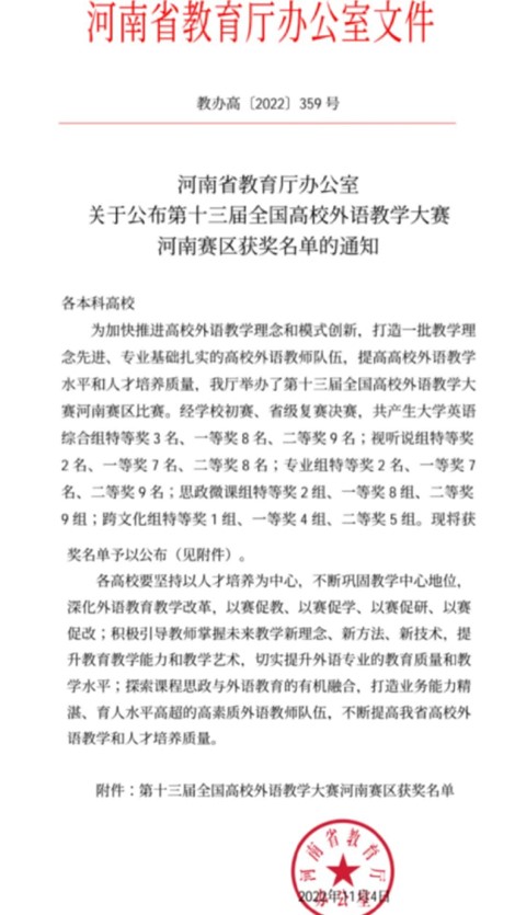 近日,河南省教育厅下发《河南省教育厅办公室关于公布第十三届全国高校外语教学大赛河南赛区获奖名单的通知》(教办高〔2022〕359号),天天干夜夜操李曦团队荣获思政微课组特等奖,张思佳荣获大学英语综合组一等奖,丁玮荣获英语专业组二等奖。