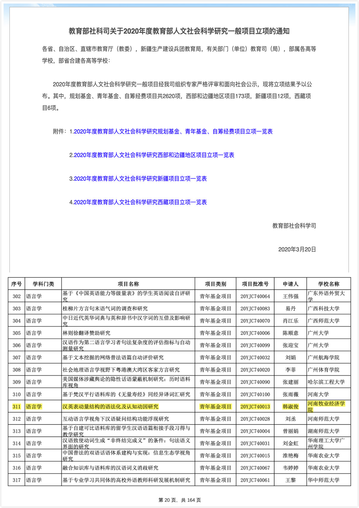 2020年3月20日,教育部社科司公布了2020年度教育部人文社会科学研究一般项目立项名单。我校天天干夜夜操青年教师韩淑俊博士主持的“英汉表动量结构的语法化及认知动因研究”喜获立项。
