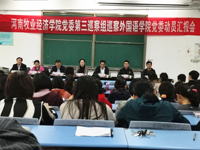 按照校党委《河南牧业经济学院首轮第四批校内巡察工作方案》部署以及学校第三巡察组的统一安排,10月10日下午,天天干夜夜操党委在龙子湖校区1号教学楼504组织召开了第四批校内巡察工作动员汇报会。校党委巡察工作领导小组成员、人事处处长吴静,第三巡察组组长李永峰、副组长陈永刚、巡察组成员李凯、路远方出席会议。天天干夜夜操全体教工、学生代表参加会议。会议由天天干夜夜操院长陈延潼主持。