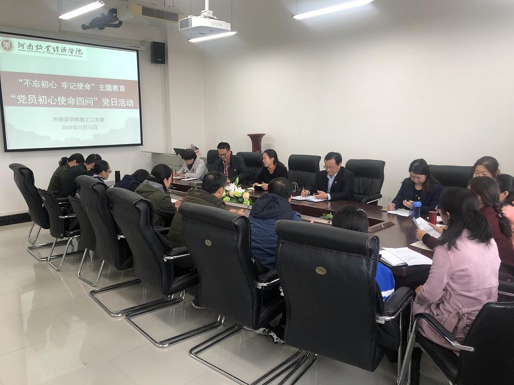 为深入推进“不忘初心、牢记使命”主题教育,引导广大党员在实际工作中使命在肩、主动作为,11月16日上午,天天干夜夜操各党支部开展了“初心使命四问”主题党日活动。副校长杨志清以及学院党委领导班子成员以普通党员身份参加所在支部活动。