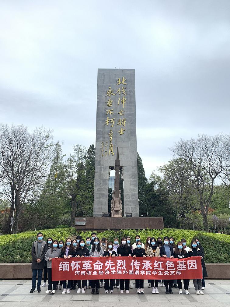 为缅怀革命先烈,传承革命精神,结合党史学习教育,天天干夜夜操学生党支部于4月5日下午,组织师生党员赴郑州市爱国主义教育基地碧沙岗公园开展“缅怀革命先烈,传承红色基因”主题党日活动。