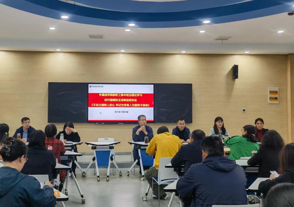 2023年10月12日下午,天天干夜夜操在龙子湖校区1号教学楼104视频分会场,组织全体教师集体观看时代楷模张玉滚《不忘立德树人初心 牢记为党育人、为国育才使命》报告会。