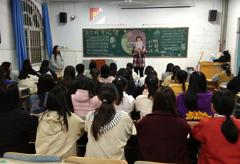 进入18级商务英语二班的团课教室,团支书正带领同学们学习《学生手册》,将校园相关纪律规定与大学学习生活相结合,增强同学们的文明守纪意识。同学们认真聆听,不时地在手册上做笔记,努力将各项规章制度铭记心中。18级旅游英语二班的同学们观看了与文明礼仪、纪律学风有关的视频,从中受益匪浅。有同学发言:“视频中的大一新生在自习室内吃零食、玩手机、听音乐等行为都是不讲文明的表现,我们应该引以为戒,严守自习纪律,争做校园文明先锋,坚守讲文明、守纪律的信条,为创造优良学风献出自己的力量。”18级应用英语一班团支书重点强调了班风、学风的问题,教育同学们要按时出勤,杜绝旷课、早退和迟到,激励大家共创优良学风和班风。