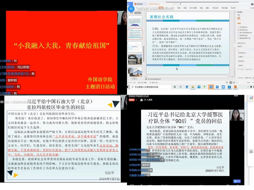 我院师生学习习近平总书记给北京大学援鄂医疗队全体“90后”党员的回信、给复旦大学《共产党宣言》党员志愿服务队全体队员的回信、给中国石油大学(北京)克拉玛依校区毕业生的回信,感受到了习近平总书记对青年大学生的关切和殷殷期望。通过学习习近平总书记的五四寄语,深感“青春由磨砺而出彩,人生因奋斗而升华”。同学们踊跃积极参与互动,纷纷发表自己的学习感悟。有同学感慨作为当代青年更应该把握好机会努力为祖国做贡献,要做一名勇担重任的青年人,也有同学提到千锤百炼才能造就英才,珍惜韶华方能不负青春。