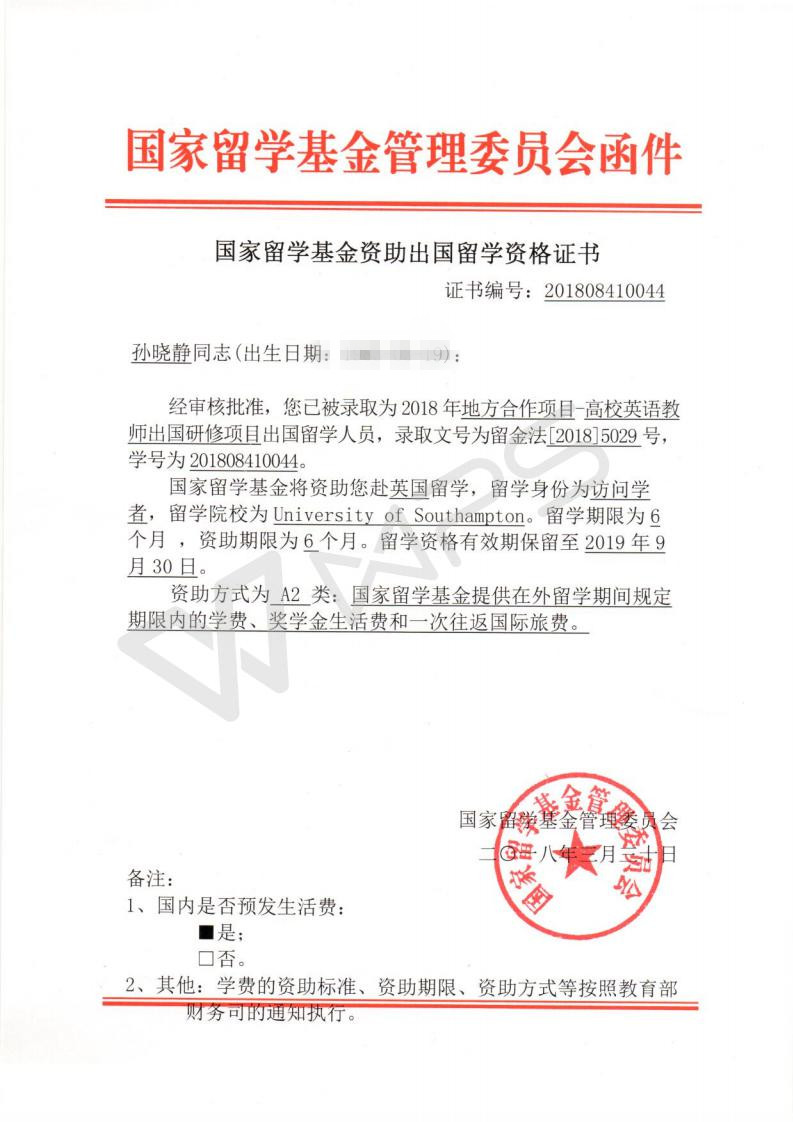 近日,省教育厅下发文件,我院教师孙晓静经过个人申报、单位推荐、省教育厅初评选拔,国家留学基金委再次评审选拔,成功入选2018年国家留学基金委河南省地方合作项目(第一批)资助“高校英语教师出国研修项目”,获得公派留学资格,将赴英国南安普顿大学(University of Southampton)留学,这是我院继去年左红霞老师首获该项目资助后,再次有老师获得该项目资助。