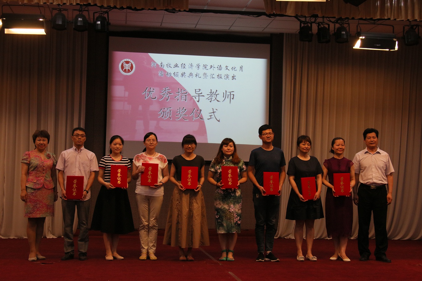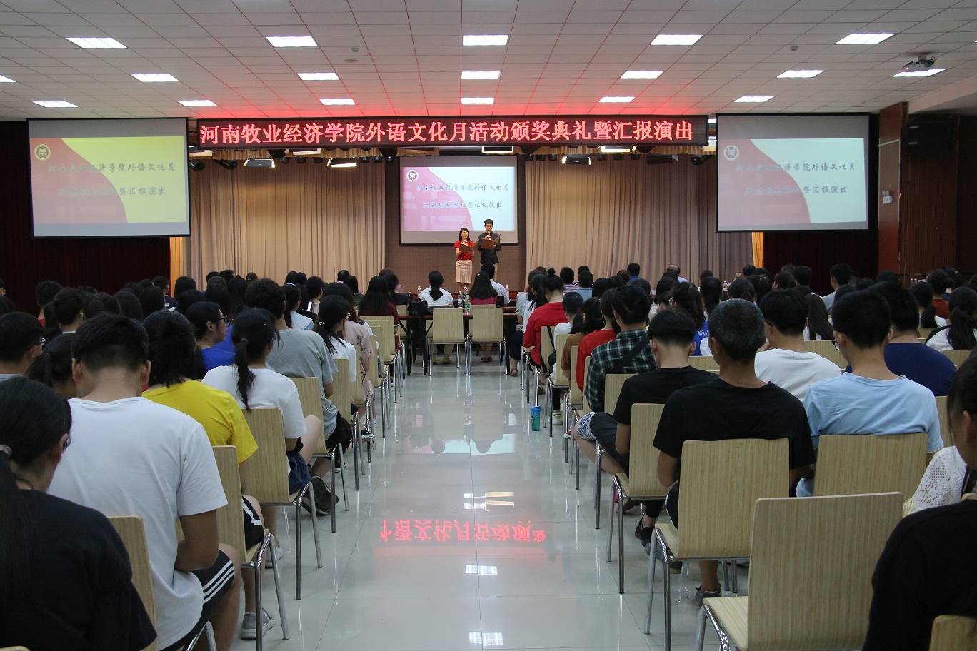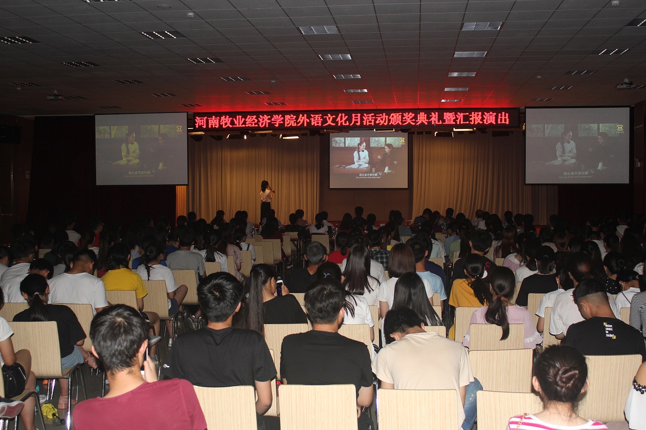 随着一系列比赛活动的结束,6月14日下午四点,天天干夜夜操在龙子湖校区大学生活动中心举办了“河南牧业经济学院外语文化月活动颁奖典礼暨汇报演出”,总结外语文化月系列活动并进行成果展示。副校长许圣道,校党委机关工委书记王建昌,学工部部长、学生处处长张广芝,团委副书记杨莉以及天天干夜夜操党政领导莅临本次活动。