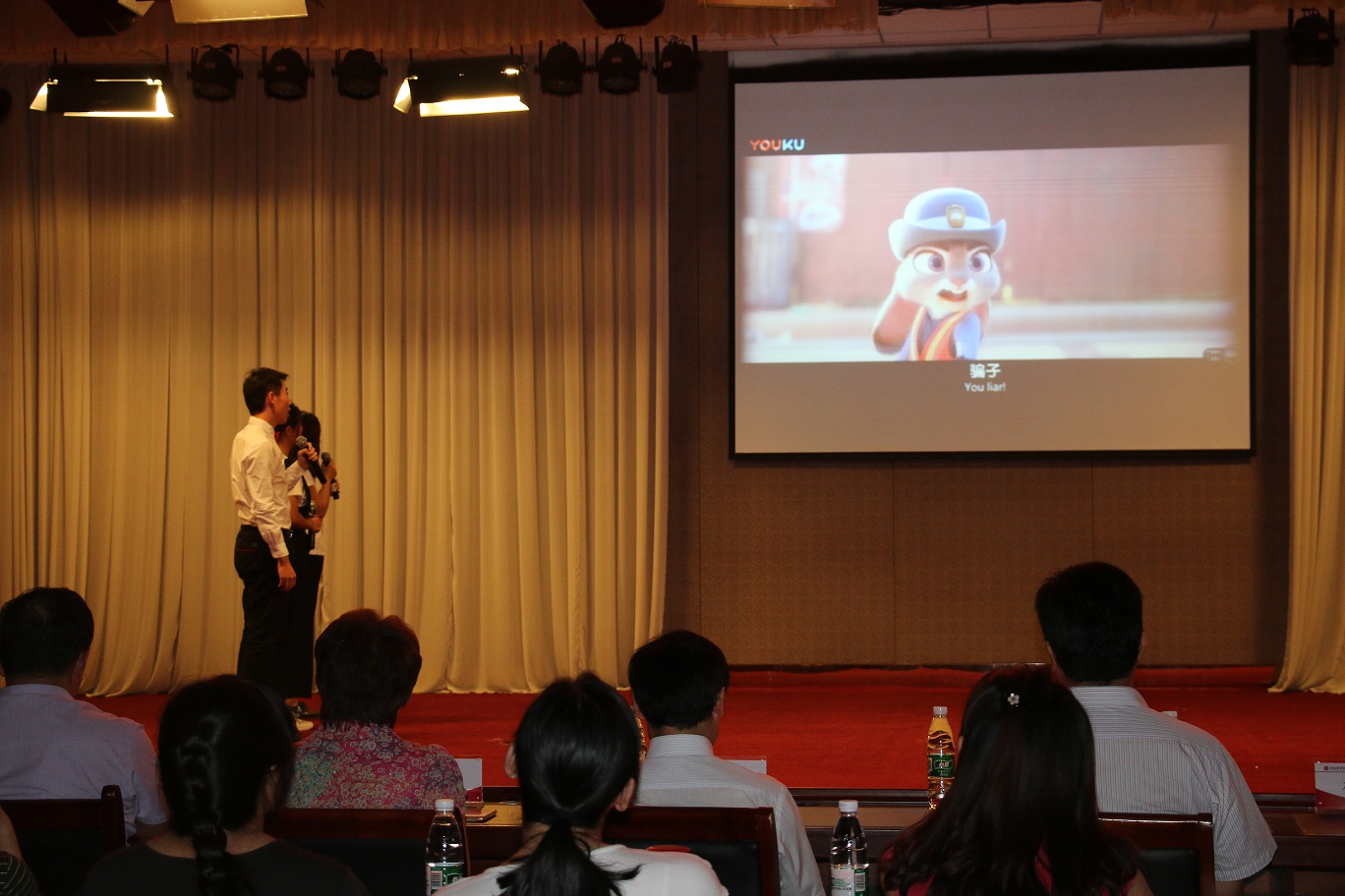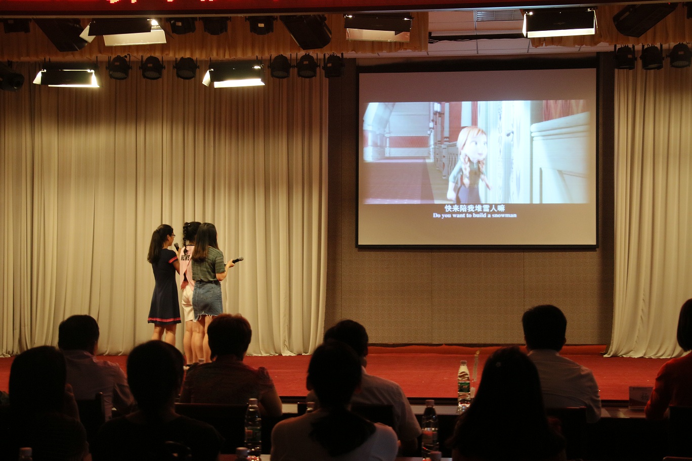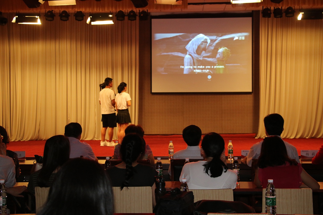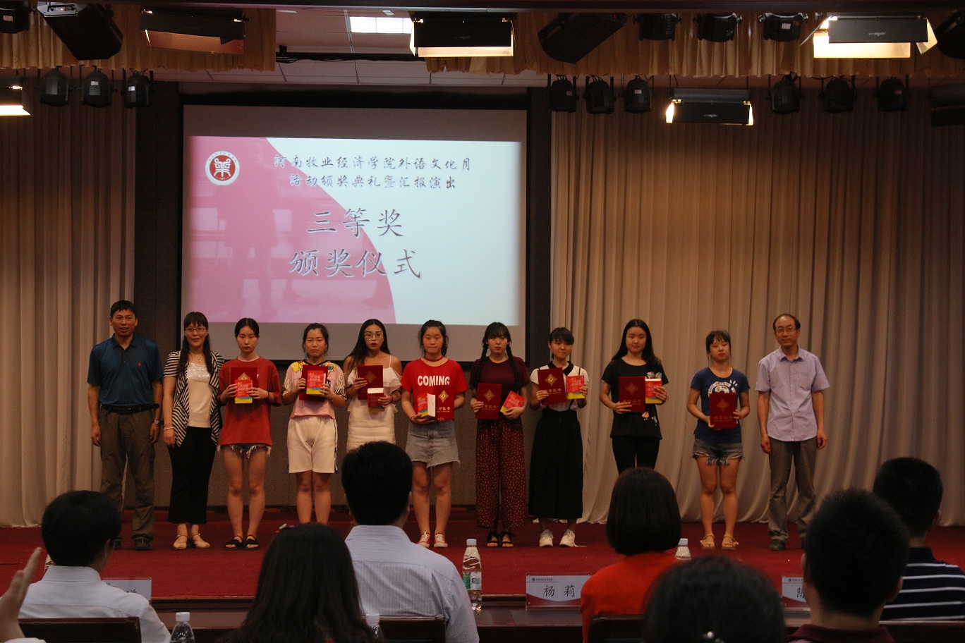 汇报演出在国际教育学院的同学们带来的电影配音表演《天生一对》中拉开了帷幕。随后各项赛事的颁奖仪式与获奖选手的演出穿插进行。有经济贸易学院、工程管理学院选送的《公主日记》配音表演,物流与电商学院的选送《小王子》配音表演,制药工程学院选送的《疯狂动物城》配音表演,艺术学院选送的《冰雪奇缘》配音表演,还有荣获全国高等院校英语导游服务三等奖的天天干夜夜操旅游英语专业学生王颖颖带来的英文导游讲解----紫禁城,为观众带来了一场英语技能和英语文化的盛宴,充分展现了我校大学生的英语综合应用能力,赢得了嘉宾和观众的一致好评。副校长许圣道,校党委机关工委书记王建昌,学工部部长、学生处处长张广芝,团委副书记杨莉等嘉宾领导为荣获优秀组织奖、优秀指导教师奖及各项赛事一二三等奖的获奖集体和师生颁奖。