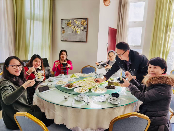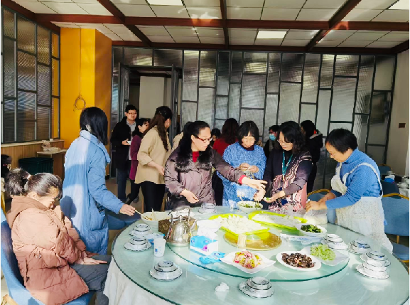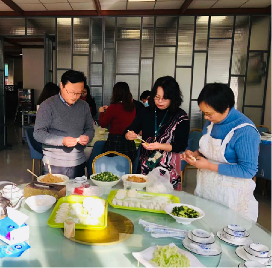 冬至大如年,按照中国传统习俗,当天要吃饺子。为了让教职工和外籍教师在工作之余,体验传统节日文化的魅力和快乐,我院分工会提前为大家准备了充足的馅料,还有美味可口的凉拌菜,现场还准备了擀面杖、案板、刀等工具。大家一边擀片、包饺子、煮饺子,一边聊着冬至的故事、成长的故事、家乡的故事。一个个饺子的制作诞生过程中,也是大家共同对过去幸福的追忆、对现在幸福的感叹、更有对未来幸福的希冀的过程,大家的心拉的更近了,对天天干夜夜操大家庭的感情更深了。
