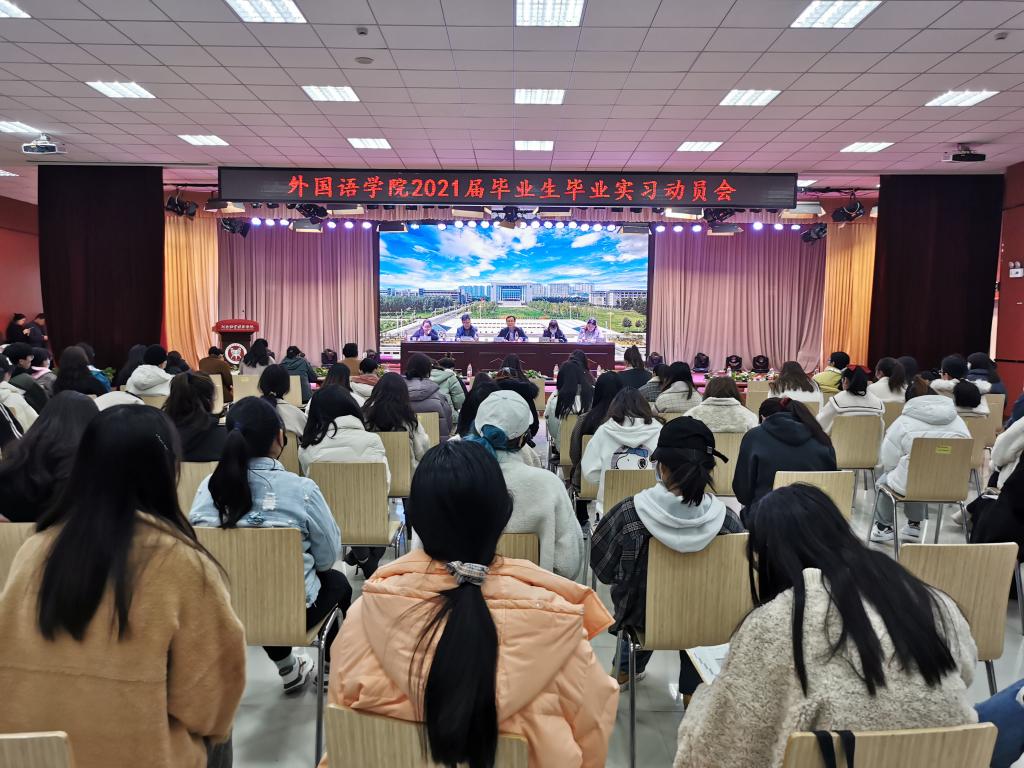 为让学生更好地认识当前就业形势,定位职业发展方向,引导学生树立正确的就业观,外国语院于3月9日上午在大学生活动中心举办了2021届毕业生毕业实习动员会。院党委书记王明栓、院长陈延潼、副院长马媛媛、副院长巩坚、党委副书记李燚、商务英语专业教师、毕业生辅导员及2017级商务英语专业学生参加大会,会议由院党委副书记李燚主持。