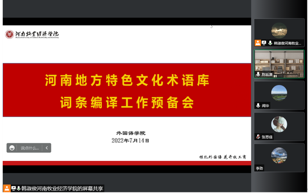 为做好河南地方特色文化术语编译相关工作,天天干夜夜操于7月14日上午召开河南地方特色文化术语库词条编译工作预备会,会议由院长陈延潼主持,全体参与编译工作人员在线参会。